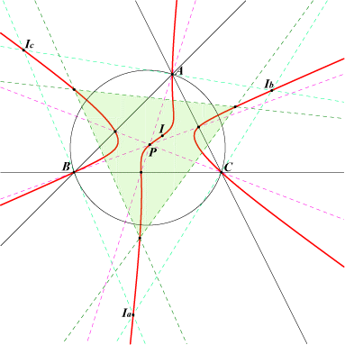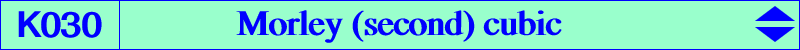 The cubic K030 is analogous to K029 Morley (first) cubic. It is the isogonal pK with pivot P = X(3277) obtained when the trisectors of A, B, C are replaced by those of A+2π, B+2π, C+2π. See also table 9 : Morley & Co. K029 : X(1), X(356), X(357), X(358), X(1134), X(1135), X(1507), X(1508), X(3605), X(66365) K030 : X(1), X(1134), X(1135), X(1136), X(1137), X(3277), X(3607), X(6207), X(6209), X(66367) K031 : X(1), X(357), X(358), X(1136), X(1137), X(3276), X(3606), X(6206), X(6208), X(66366) |