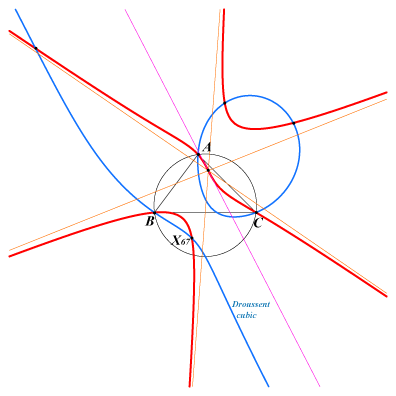 The Droussent central cubic is the central pK with center the midpoint of X(6)X(110), pivot the anticomplement X(11061) of X(67), pole X(187). It is the locus of point M such that the parallels at M to AX(67), BX(67), CX(67) meet the corresponding sidelines of ABC in three points forming a triangle perspective to ABC. This cubic is remarkable in the sense that the locus of the perspector is the DROUSSENT cubic. See also Walsmith triangle at K1091. |