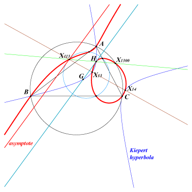 O(X4) is the orthopivotal cubic with orthopivot H. See the FG paper "Orthocorrespondence and orthopivotal cubics" in the Downloads page and Orthopivotal cubics in the glossary. See also K295 and K001, property 3. It is the circular pK with pivot H and pole X(1990), intersection of the orthic axis and the line HK. Its singular focus is X(125). Its orthic line is the Euler line. It is the anti-orthocorrespondent of the Kiepert hyperbola. K059 is an antigonal cubic and a member of the class CL019 of cubics. The isogonal transform of K059 is K114. |