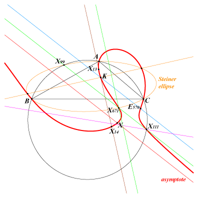 O(X111) is the orthopivotal cubic with orthopivot the Parry point. See the FG paper "Orthocorrespondence and orthopivotal cubics" in the Downloads page and Orthopivotal cubics in the glossary. The singular focus is the Lemoine point K whose polar conic is the circle passing through X(6), X(23), X(111), X(381), X(671), X(2080). K063 is the locus of contacts of tangents drawn from K to the circles passing through X(111) and X(671). The isogonal transform of K063 is K435, a central circular cubic. |