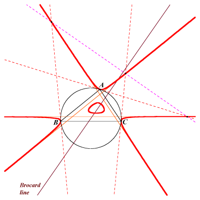K081 is a member of the class CL020 of "equal power cubics". It is the locus of point P whose pedal circle passes through H i.e. is orthogonal to the circle centered at H with radius 0. Hence, K081 is a member of the class CL036. The power of any point P on the cubic with respect to its pedal circle is constant. Its value is -4R^2 cosA cosB cosC. K081 is an isogonal nK with root X(2) = G. Its asymptotes are parallel to the sidelines of ABC and meet the cubic again at three points on a perpendicular to the Brocard line. |
