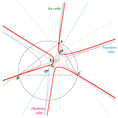 This cubic belongs to the pencil of cubics containing the Napoleon cubic, the Kn cubic. See "Two Remarkable Pencils..." in the Downloads page. Its asymptotes are parallel to those of the Thomson cubic. K124 also belongs to the pencil generated by the Thomson cubic and the Lucas cubic. |