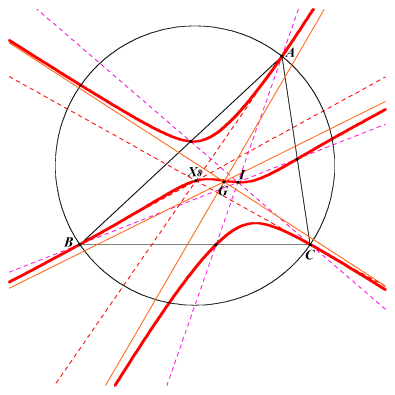 K157 = pK(X9, X1) is a member of the classes CL009 of cubics hence it has three asymptotes concurring at G. See also Table 37. For any point P on the cubic, there is a pK with same pole X(9) having its asymptotes parallel to the cevians of P. For example, with P = X(8), the required cubic is K201 = pK(X9, X145). The isogonal transform of K157 is pK(X604, X56) and its isotomic transform is pK(X85, X7). |
