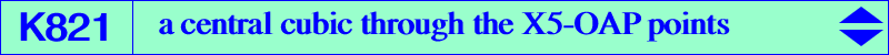 K821 is a central cubic with center X(140) that passes through the four X5-OAP points. These points lie on the stelloid K665 and on a rectangular hyperbola (H) passing through X(140), X(550) and homothetic to the Jerabek hyperbola. K821 meets K005 at three points on the line at infinity and six other finite points namely A, B, C, H, Q1, Q2. These two latter points are the common points of the line X(140)X(195) and the circum-rectangular hyperbola (H') passing through X(549). Their midpoint is obviously X(140). |