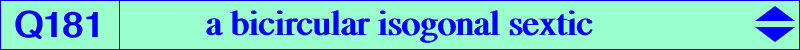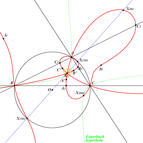 This (partly) answers a question from Dan Reznik : given a triangle ABC and a point P what is the locus of points X such that the reflection of the P-cevians about the X-cevians concurs ? (private message 2022-10-19). It is known that the reflections of the cevian lines of any point X in the corresponding internal bisectors of ABC (i.e. the cevian lines of I = X(1)) concur at the isogonal conjugate Y of X. On the other hand, the reflections of the cevians lines of X(1) in the cevian lines of X concur if and only if X lies on Q181. Q181 is a bicircular isogonal circum-sextic that passes through : • A, B, C which are nodes. The nodal tangents at A pass through the intersections of (O) and the line OIa, where Ia is the A-excenter of ABC. • X(1) which is a triple point with tangents parallel to the asymptotes of the McCay cubic K003. • the circular points at infinity J1, J2 which are nodes. The remaining points at infinity are X(3307), X(3308), on the Feuerbach hyperbola. • the incenters and excenters of triangles BCI, CAI, ABI. • A1, A2 on the sideline BC and on the circle passing through X(1), X(484) and A. The points B1, B2 on AC and C1, C2 on AB are defined cyclically. • A3, A4 on the external bisector at A and on the circle passing through X(1), X(484) whose center is on this same bisector and obviously on the perpendicular bisector of X(1), X(484). More generally, every circle passing through X(1), X(484), whose center is Ω, meets Q181 at 12 points, namely J1, J2 (each double), X(1) (triple), X(484) and two pairs of isogonal points that lie on two perpendicular lines secant at the isogonal conjugate gΩ of Ω, a point on the circum-conic with center X(10), perspector X(37). These two perpendicular lines are parallel to the asymptotes of the rectangular circum-hyperbola which is the isogonal transform of the perpendicular at O to the line ΩX(1). *** Generalization When the incenter X(1) is replaced by a fixed point P not lying on a sideline of ABC, the reflections of the cevians lines of P in the cevian lines of X concur if and only if X lies on a bicircular circum-sextic S(P) passing through the in/excenters. With P = X3, S(P) decomposes into the inversible circular quartic Q023 and the circumcircle. With P = X4 : S(P) decomposes into the antigonal circular quintic Q038 and the line at infinity. Each locus is the isogonal transform of the other. This holds for the two sextics S(P), S(P*) obtained when P, P* are two distinct isogonal conjugate points. At last, note that, when X is a given point, the locus of point P is generally a strophoid. See CL038. In particular, Q181 is the locus of nodes of non-isogonal circum-strophoids that pass through the incenter I = X(1).